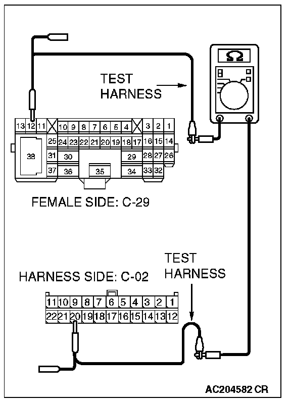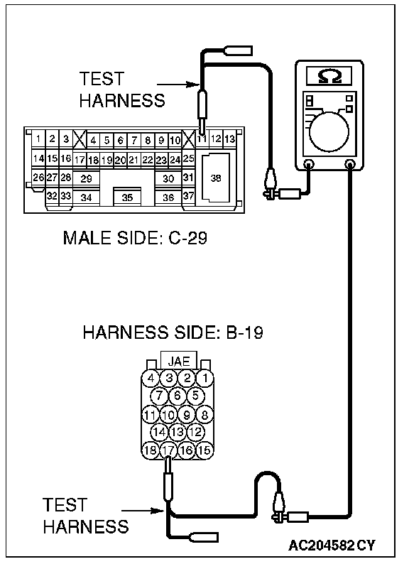 1. Disconnect intermediate connector C-29 and powertrain control module connector B-19, and measure the resistance between the wiring harness side connector of powertrain control module connector B-19 and the male side connector of intermediate connector C-29 (at front wiring harness side).