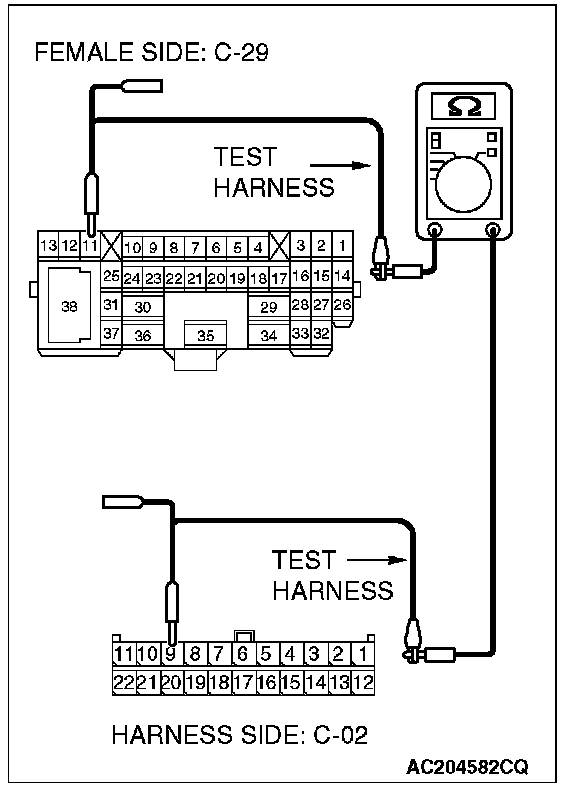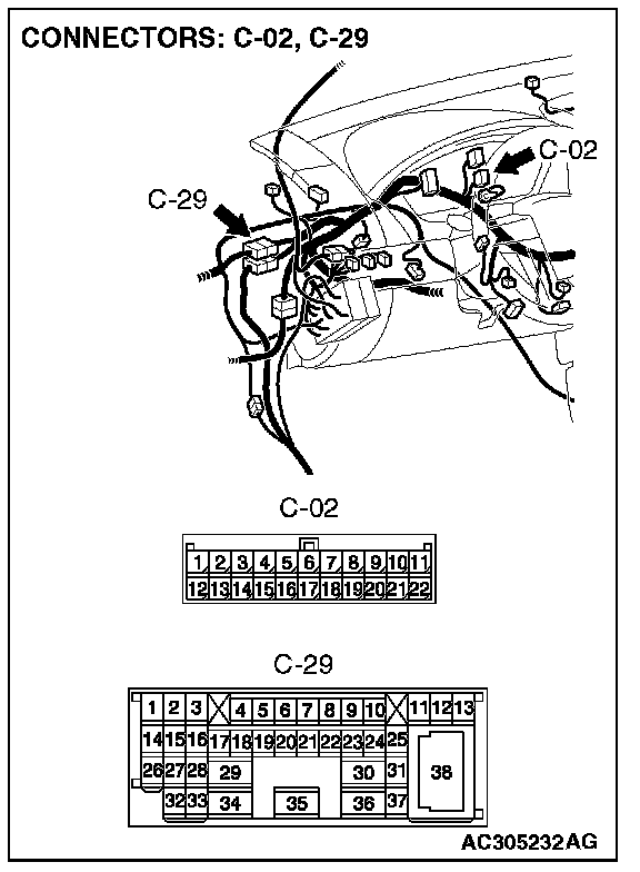 1. Disconnect joint connector (3) C-02 and intermediate connector C-29, and measure the resistance between the wiring harness side connector of joint connector (3) C-02 and the female side connector of intermediate connector C-29 (instrument panel wiring harness side).