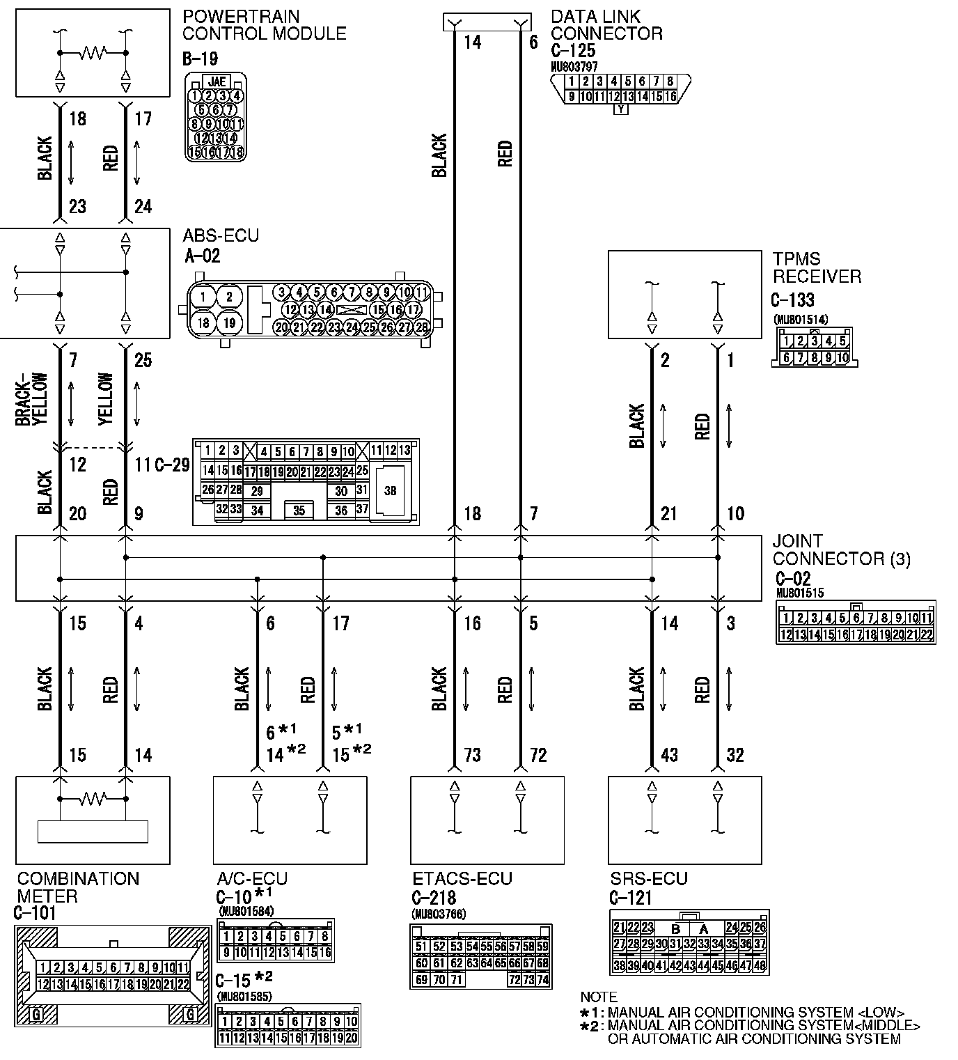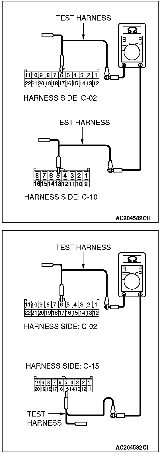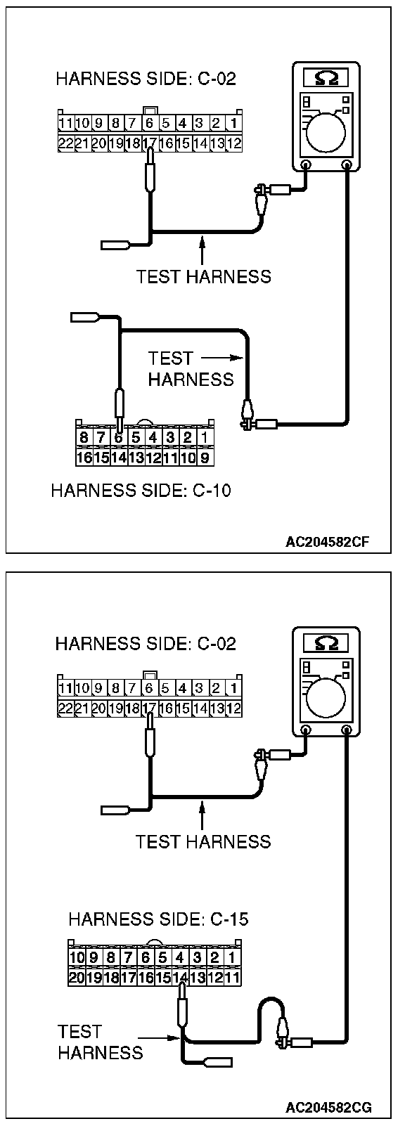 STEP 13. Check the CAN bus lines between joint connector (3) and the A/C-ECU. Measure the resistance between joint connector (3) C-02 and A/C-ECU connector C-10 [manual air conditioning system (low)] or C-15 [manual air conditioning system (middle) or automatic air conditioning system].