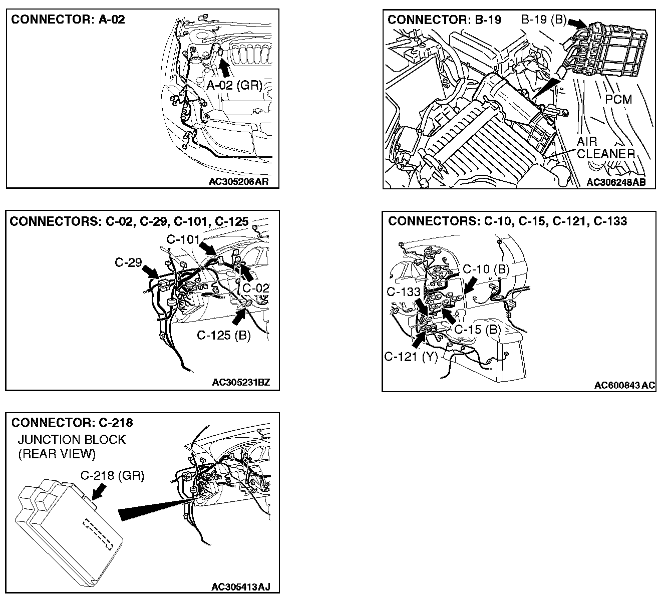 1. Disconnect joint connector (3) C-02 and A/C-ECU connector C-10 [manual air conditioning system (low)] or C-15 [manual air conditioning system (middle) or automatic air conditioning system], and measure the resistances at the wiring harness sides of joint connector (3) C-02 and A/C-ECU connector C-10 [manual air conditioning system (low)] or C-15 [manual air conditioning system (middle) or automatic air conditioning system].