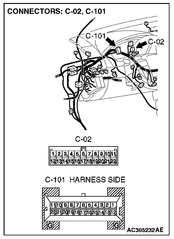 STEP 5. Check joint connector (3) C-02 and combination meter connector C-101 for loose, corroded or damaged terminals, or terminals pushed back in the connector.