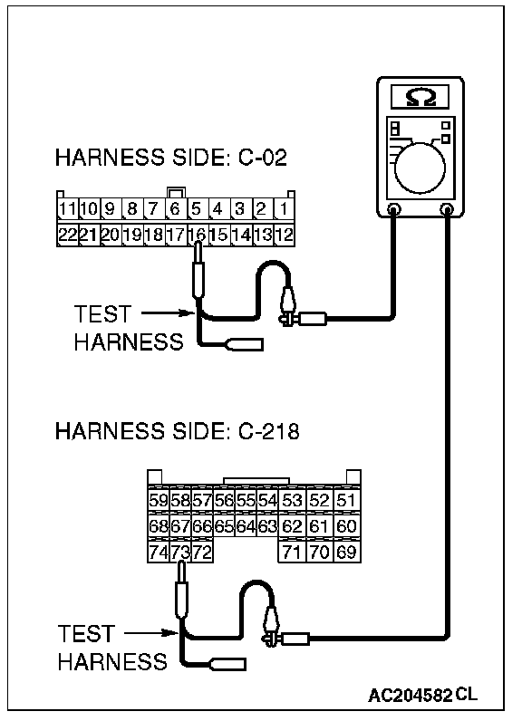 1. Disconnect joint connector (3) C-02 and ETACS-ECU connector C-218, and measure the resistances at the wiring harness sides of joint connector (3) C-02 and ETACS-ECU connector C-218.