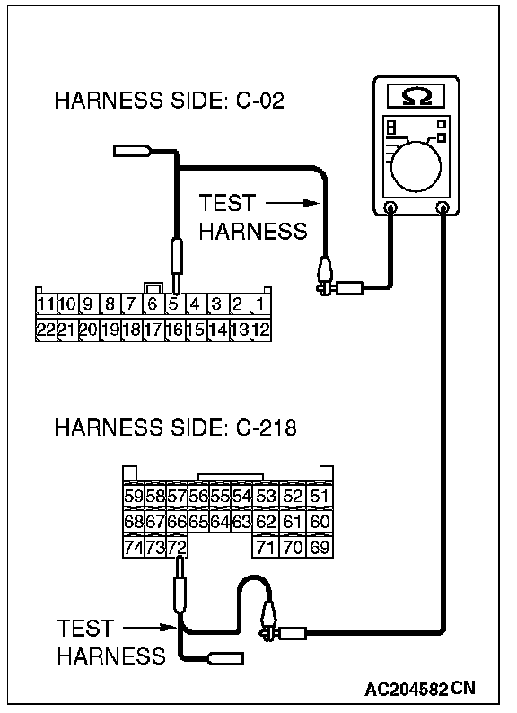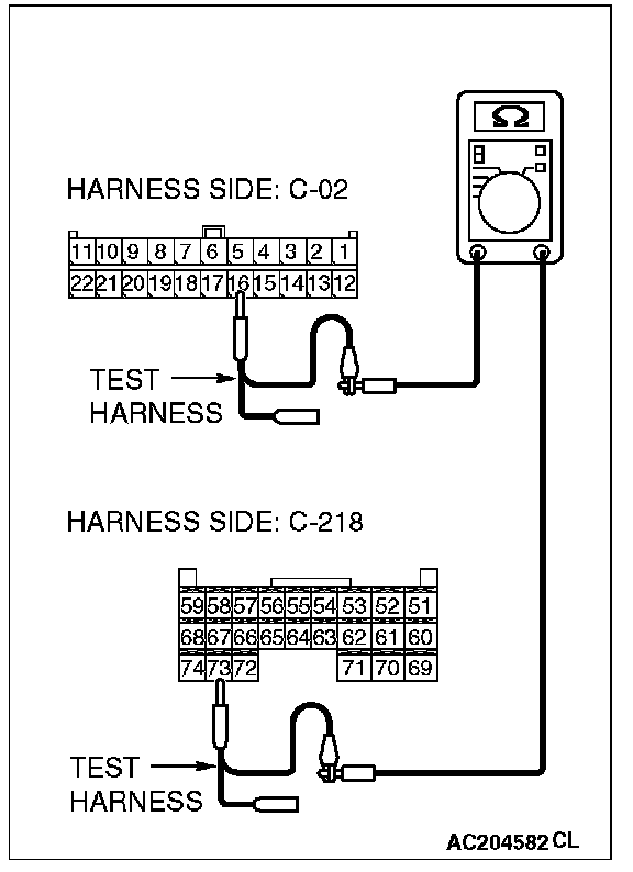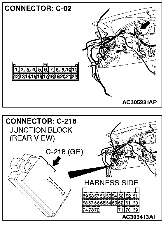 1. Disconnect joint connector (3) C-02 and ETACS-ECU connector C-218, and measure the resistances at the wiring harness sides of joint connector (3) C-02 and ETACS-ECU connector C-218.