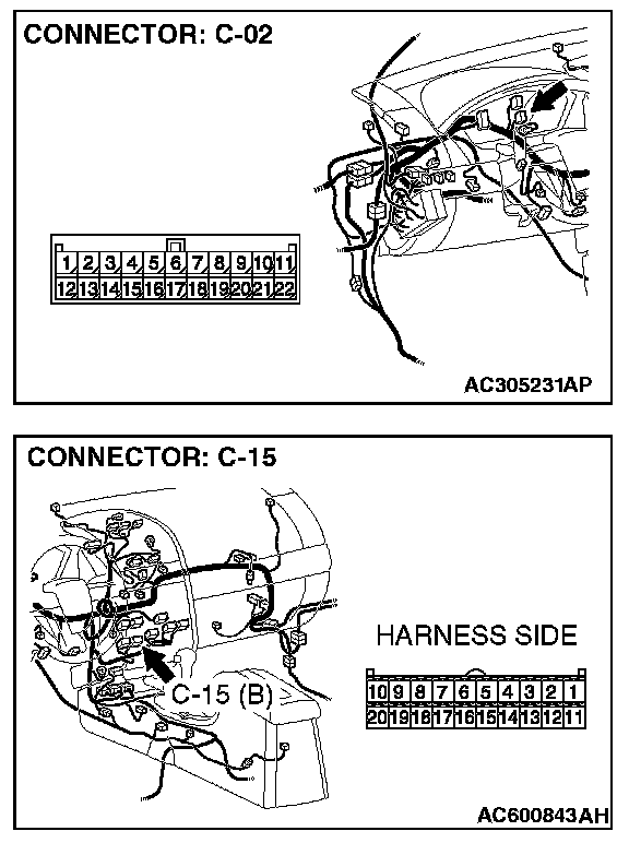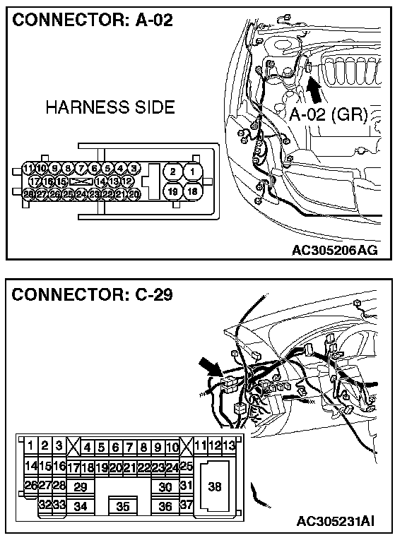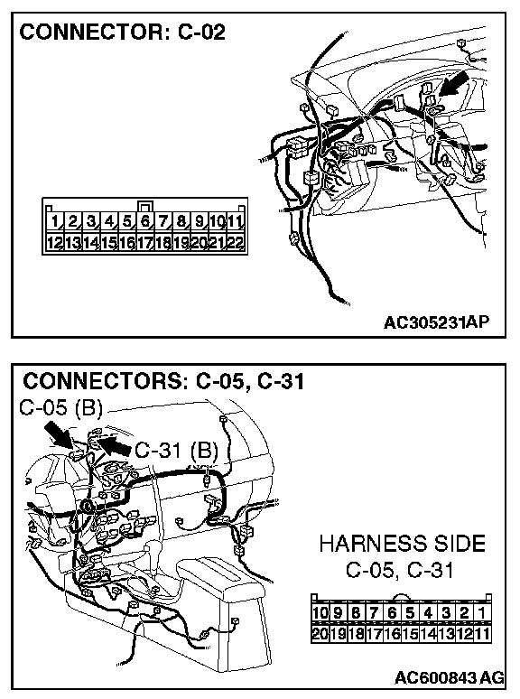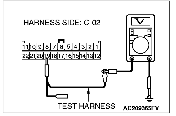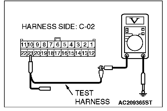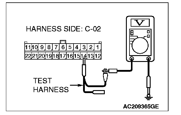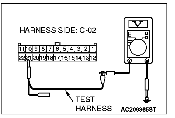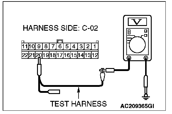 1. Disconnect joint connector (3) C-02 and multi-center display unit (middle-grade type or vehicles with mitsubishi multi communication system) connector C-05 [multi-center display unit (middle-grade type)] or C-31 [multi-center display unit (vehicles with mitsubishi multi communication system)], and measure the voltage at the wiring harness side of joint connector (3) C-02.