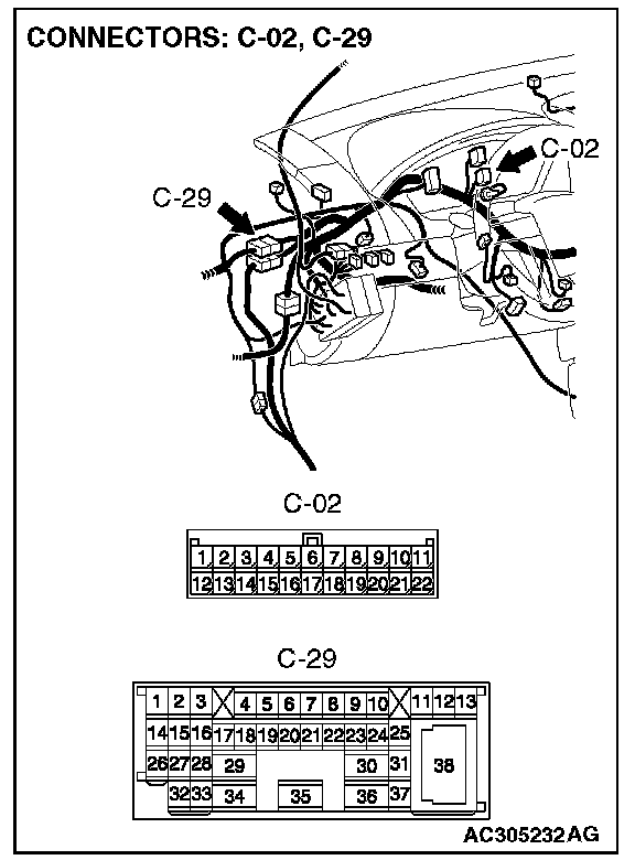 1. Disconnect intermediate connector C-29 and joint connector (3) C-02, and measure the voltage at the wiring harness side of joint connector (3) C-02.