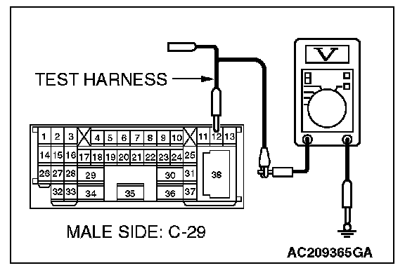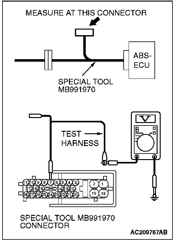 4. Measure the voltage between special tool MB991970 (ABS check harness) connector terminal 7 and body ground.