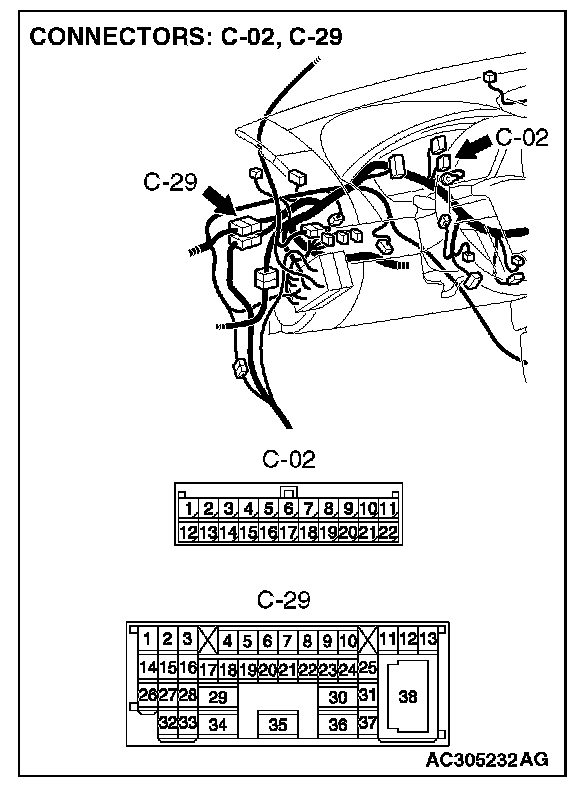 1. Disconnect intermediate connector C-29 and joint connector (3) C-02, and measure the resistance at the wiring harness side of joint connector (3) C-02.