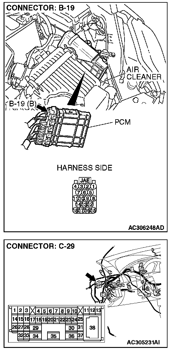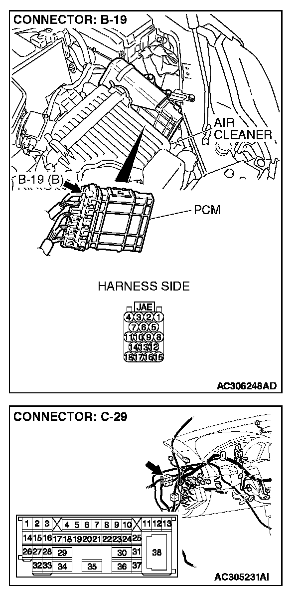 1. Disconnect intermediate connector C-29 and powertrain control module connector B-19, and measure the resistance at the wiring male side of intermediate connector C-29.
