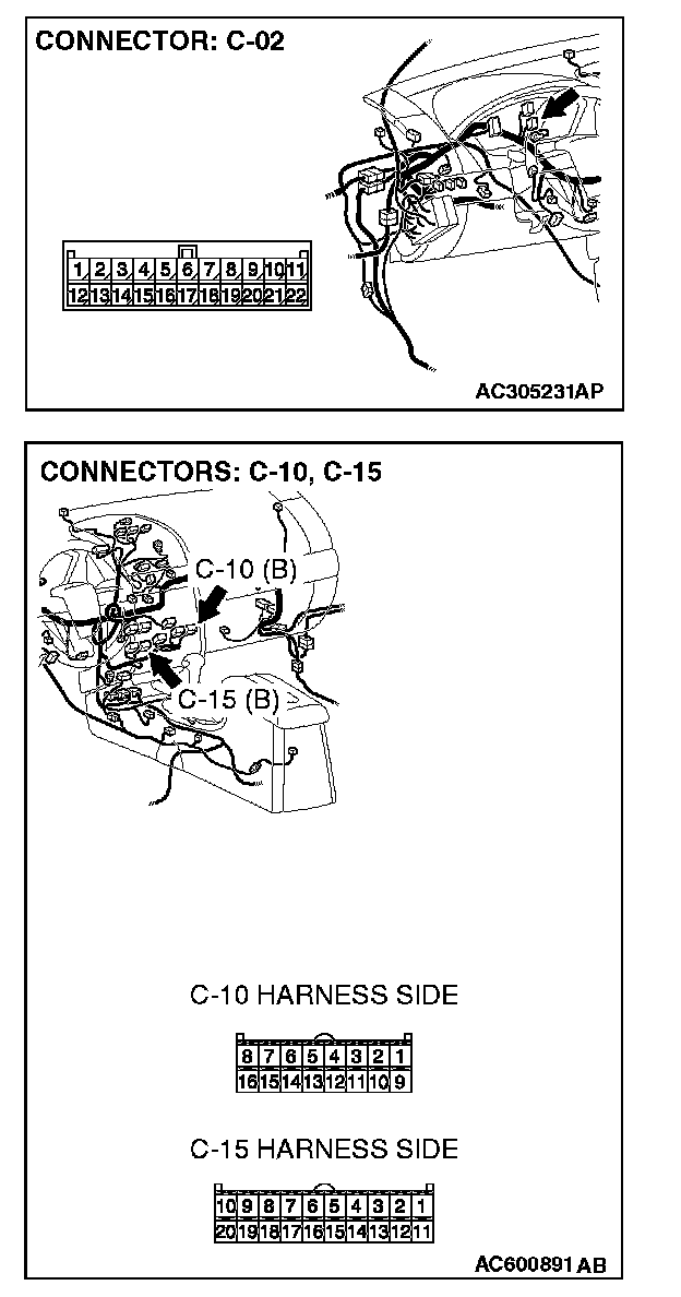 1. Disconnect joint connector (3) C-02 and A/C-ECU connector C-10 [manual air conditioning system (low)] or C-15 [manual air conditioning system (middle) or automatic air conditioning system], and measure the resistance at the wiring harness side of joint connector (3) C-02.