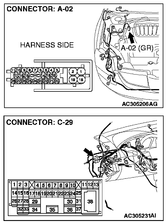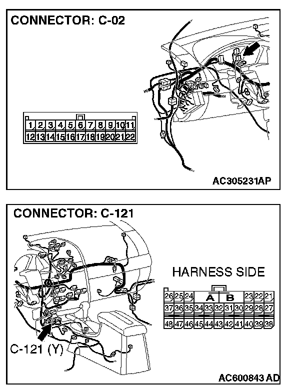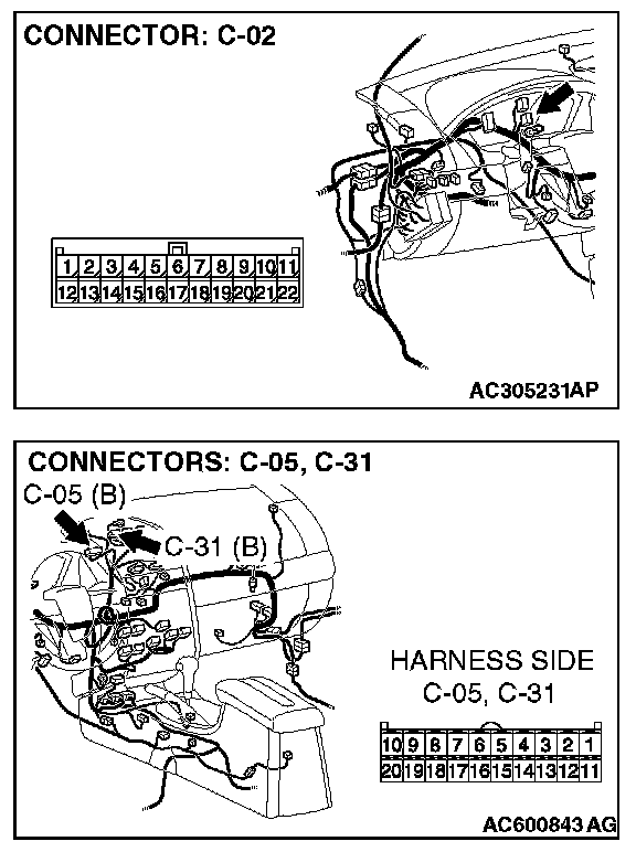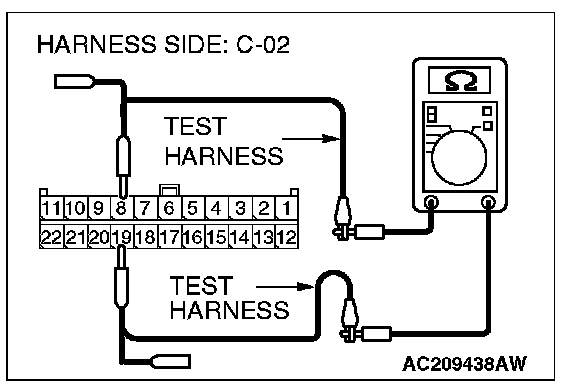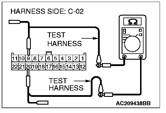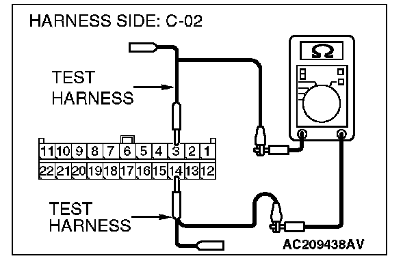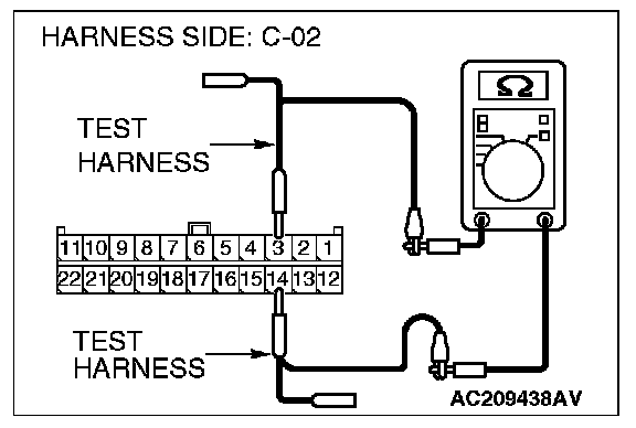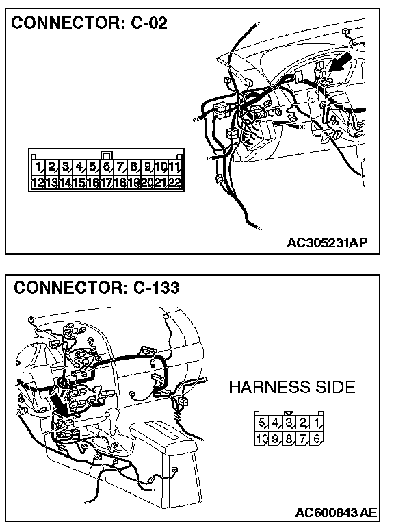 1. Disconnect joint connector (3) C-02 and multi-center display unit (middle-grade type or vehicles with mitsubishi multi communication system) connector C-05 [multi-center display unit (middle-grade type)] or C-31 [multi-center display unit (vehicles with mitsubishi multi communication system)], and measure the resistance at the wiring harness side of joint connector (3) C-02.