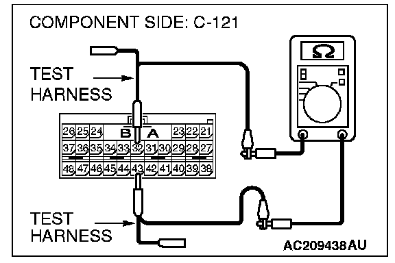 1. Disconnect SRS-ECU connector C-121, and measure the resistance at the component side of SRS-ECU connector C-121.