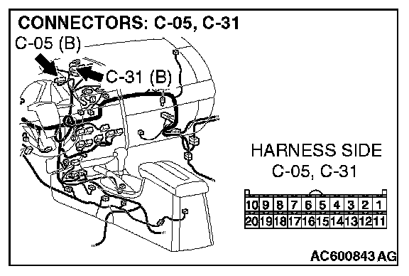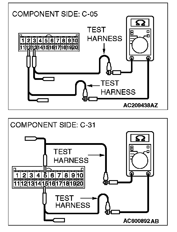 STEP 27. Check the multi-center display unit (middle-grade type or vehicles with mitsubishi multi communication system) for short circuit. Measure the resistance at multi-center display unit (middle-grade type or vehicles with mitsubishi multi communication system) connector C-05 [multi-center display unit (middle-grade type)] or C-31 [multi-center display unit (vehicles with mitsubishi multi communication system)].