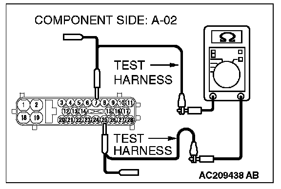 1. Disconnect powertrain control module connector B-19 and ABS-ECU connector A-02, and measure the resistance at the harness side of powertrain control module connector B-19.