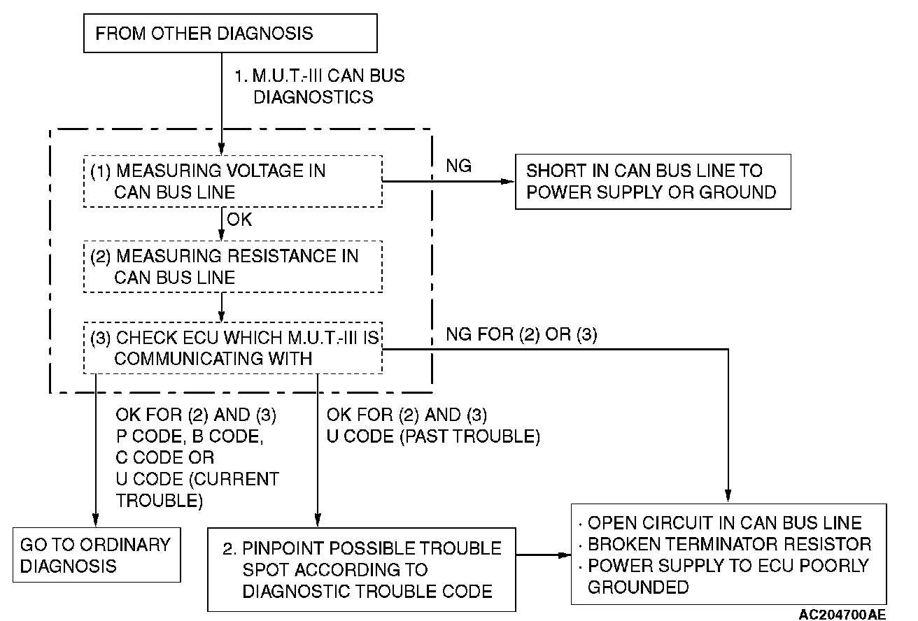 EXPLANATION ABOUT THE SCAN TOOL (M.U.T.-III) CAN BUS DIAGNOSTICSThe M.U.T.-III CAN bus diagnostics carries out the three checks below automatically, and then displays the current condition of the CAN bus lines according to the check results.