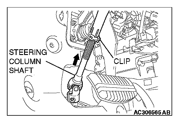2. Pinch the steering column shaft clip with pliers, and pull up the shaft in the direction shown to disengage the steering column shaft assembly.