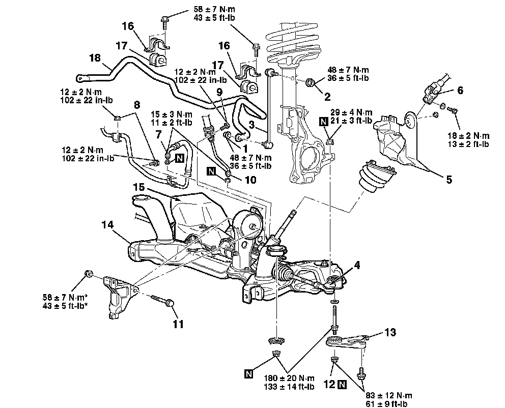 - *: Indicates parts which should be initially tightened, and then fully tightened after placing the vehicle horizontally and loading the full weight of the engine on the vehicle body.