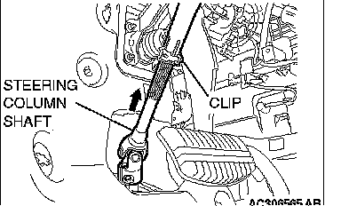 2. Pinch the steering column shaft clip with pliers and pull up the shaft in the direction shown to disengage the steering column assembly.