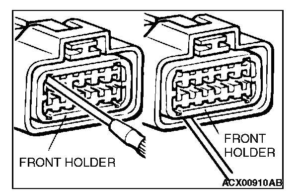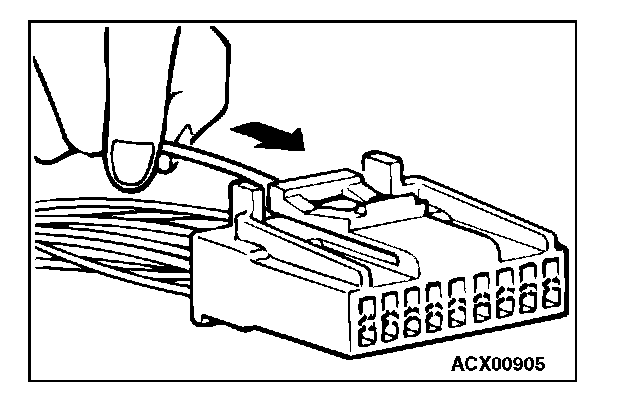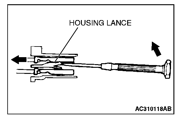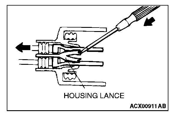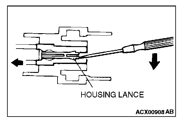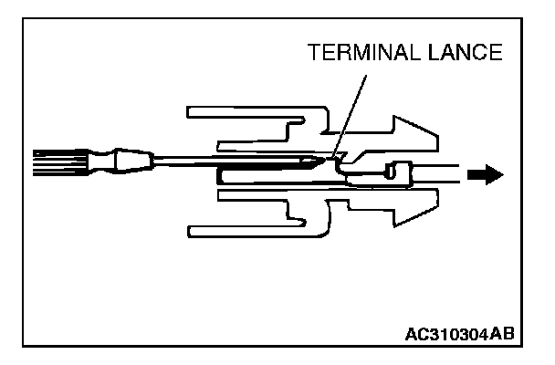 Loosely engaged terminals can be repaired by removing the female terminal from the connector housing and raising its lance to establish better engagement. Removal of the connector terminal used for MFI and INVECS-II A/T control circuit can be done in the following manner.