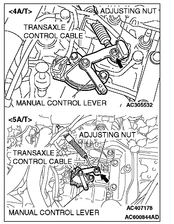 6. Gently push the transaxle control cable in the direction of the arrow, until the cable is taut. Tighten the adjusting nut.