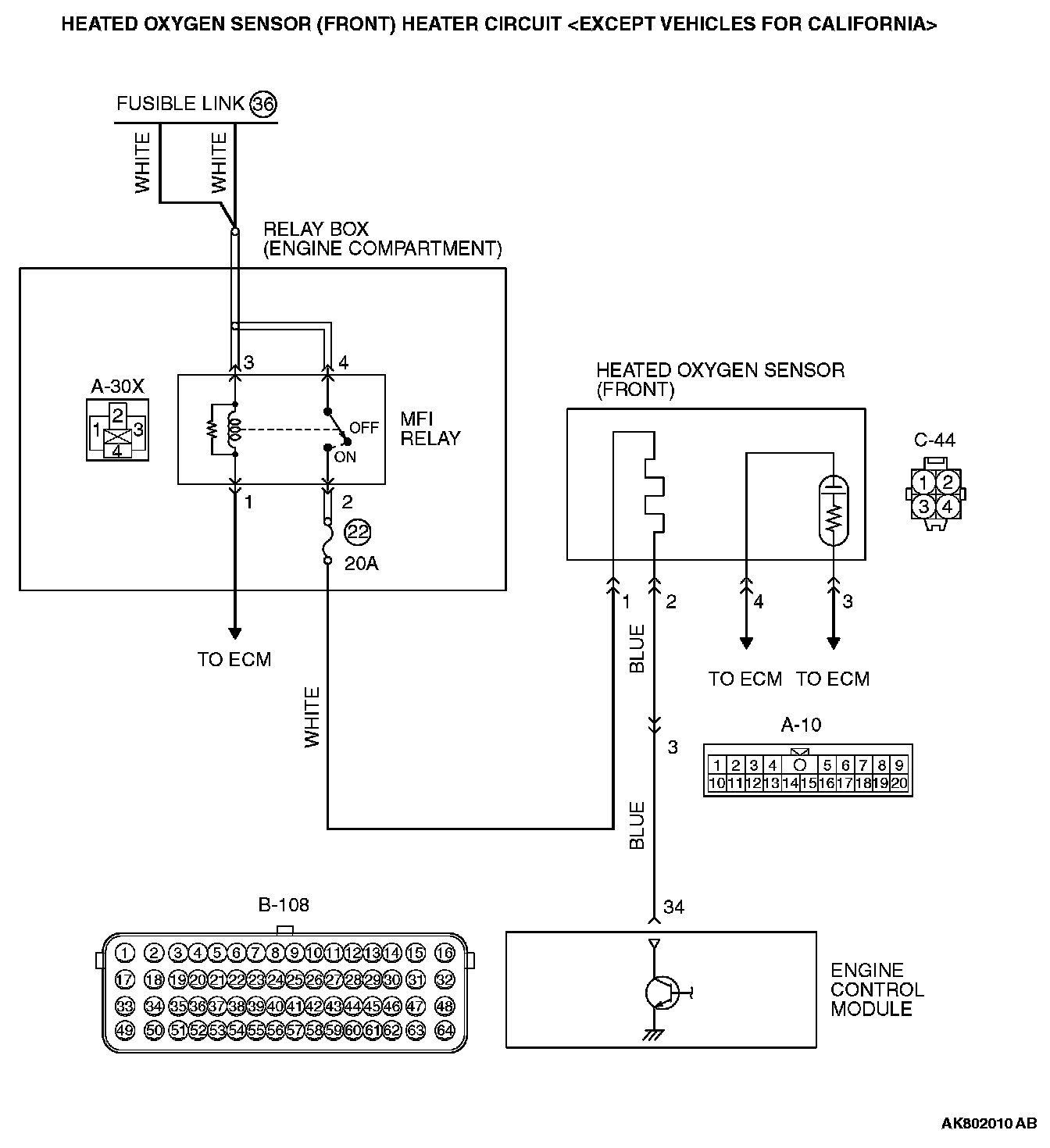 - The ECM (terminal No. 34) controls continuity to the heated oxygen sensor (front) heater by turning the power transistor in the ECM "ON" and "OFF".