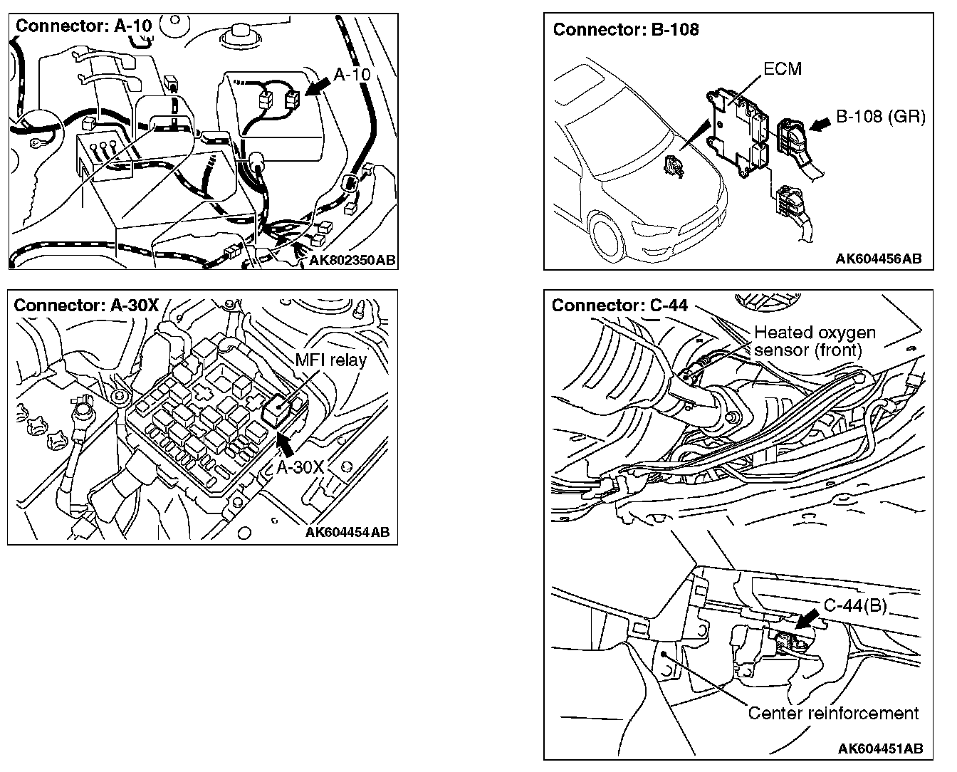 1. Disconnect heated oxygen sensor (front) connector C-44 and connect test harness special tool, MB991658, to the connector on the heated oxygen sensor (front) side.