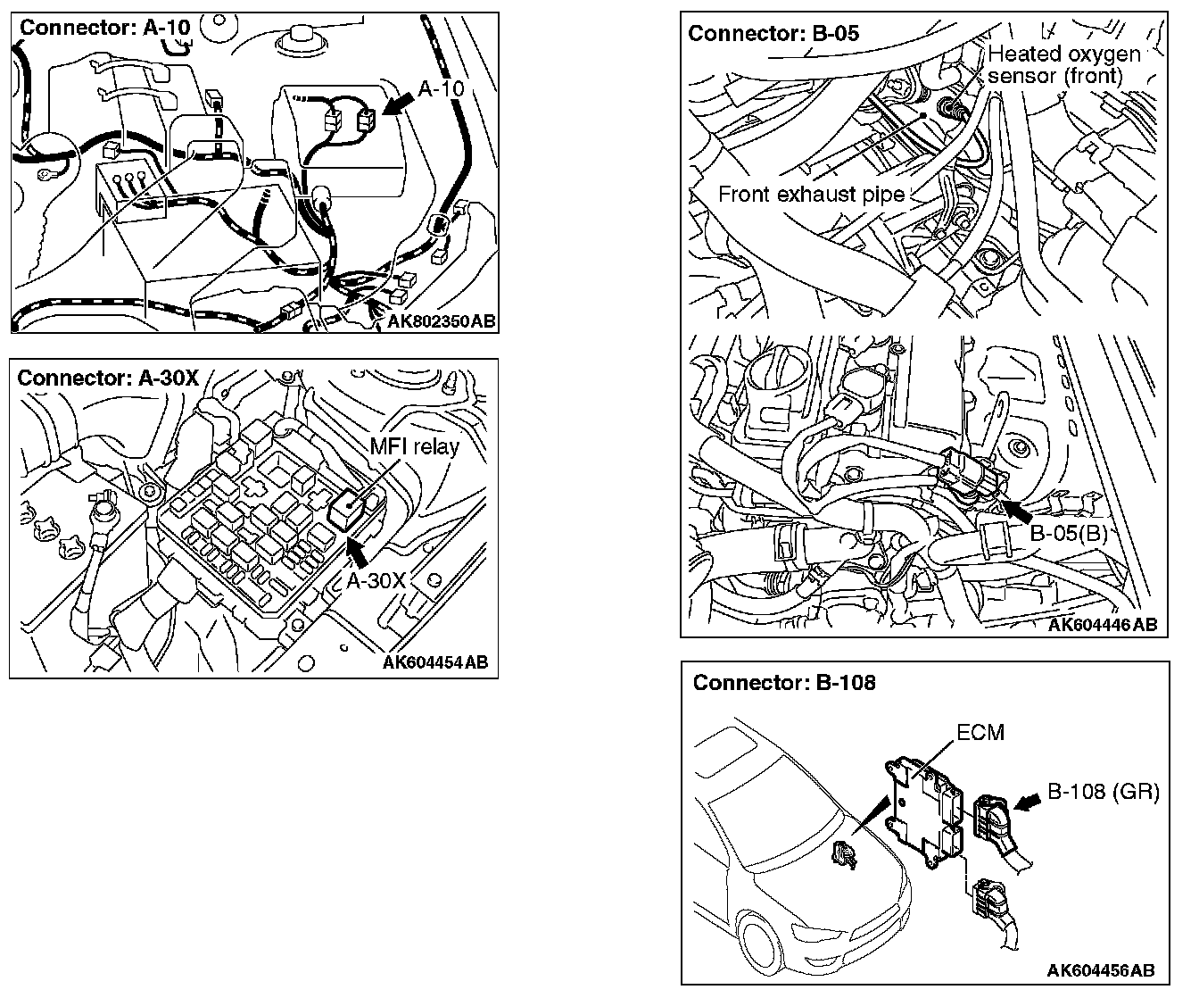 1. Disconnect heated oxygen sensor (front) connector B-05 and connect test harness special tool, MD998464, to the connector on the heated oxygen sensor (front) side.