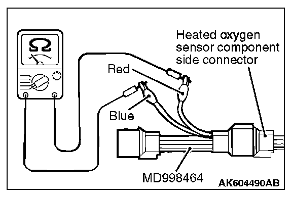 2. Measure the resistance between heated oxygen sensor connector terminal No. 1 (red clip) and terminal No. 3 (blue clip).