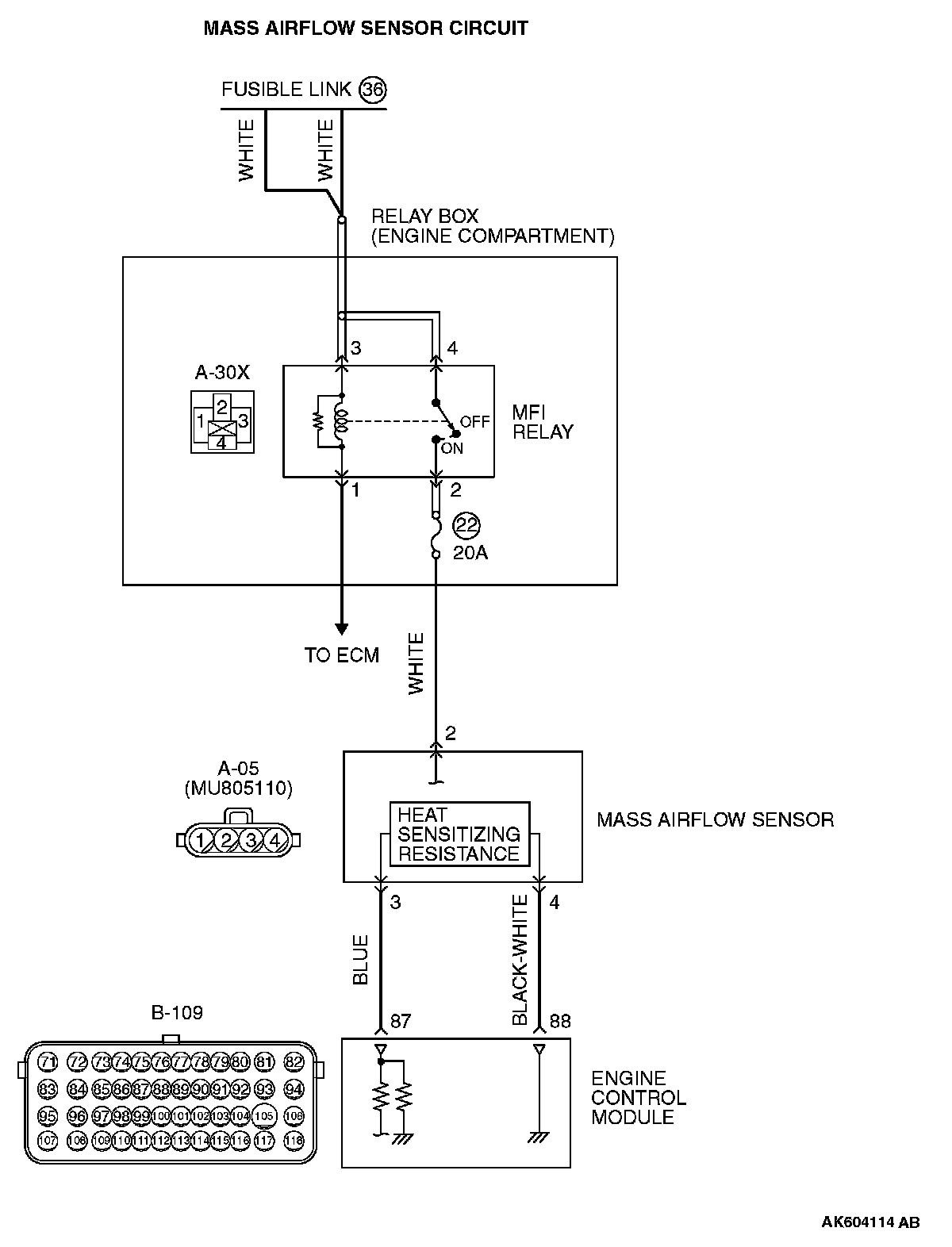 - The mass airflow sensor power is supplied from the MFI relay (terminal No. 2), and the ground is provided on the ECM (terminal No. 88).