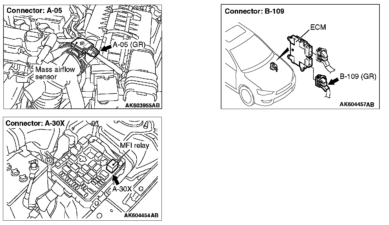 STEP 7. Check for open circuit and short circuit to ground between mass airflow sensor connector A-05 (terminal No. 3) and ECM connector B-109 (terminal No. 87).