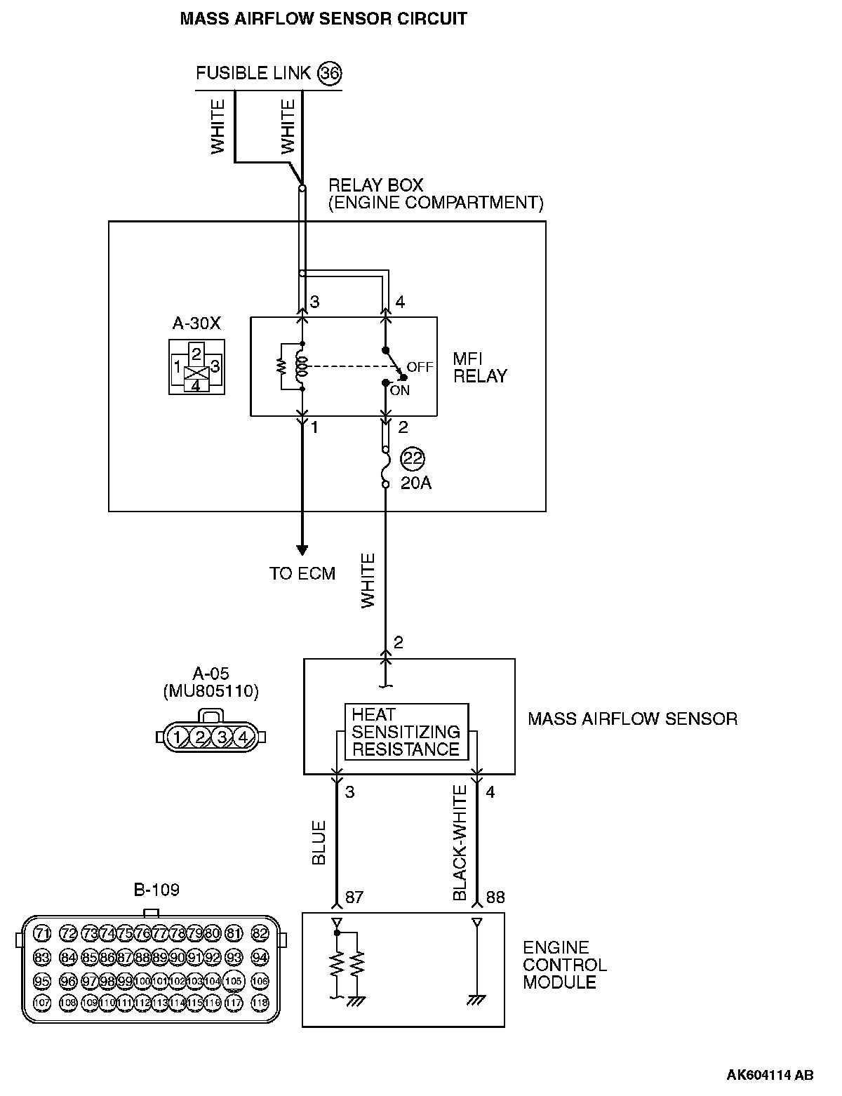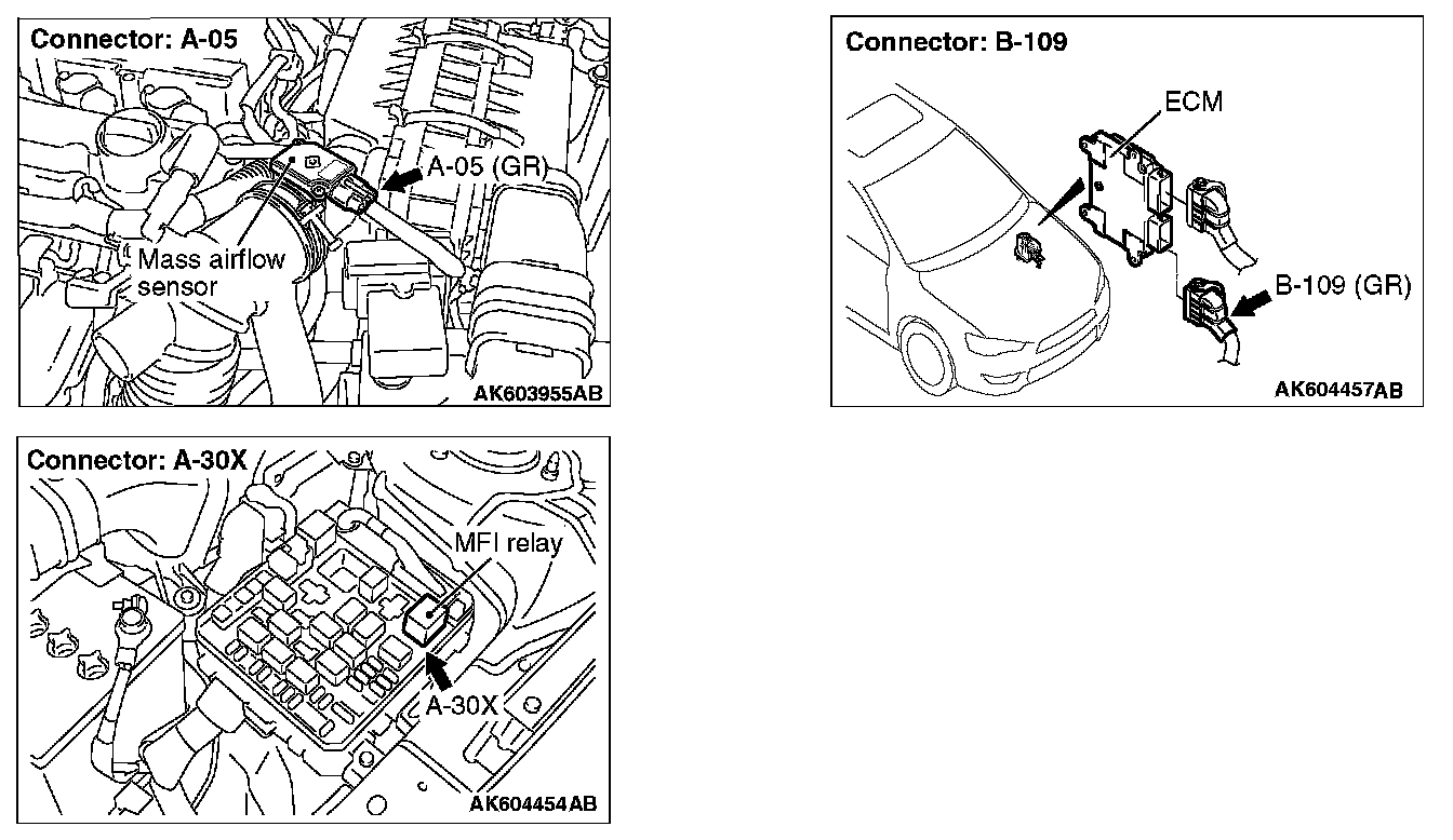 STEP 5. Check for open circuit between mass airflow sensor connector A-05 (terminal No. 4) and ECM connector B-109 (terminal No. 88).
