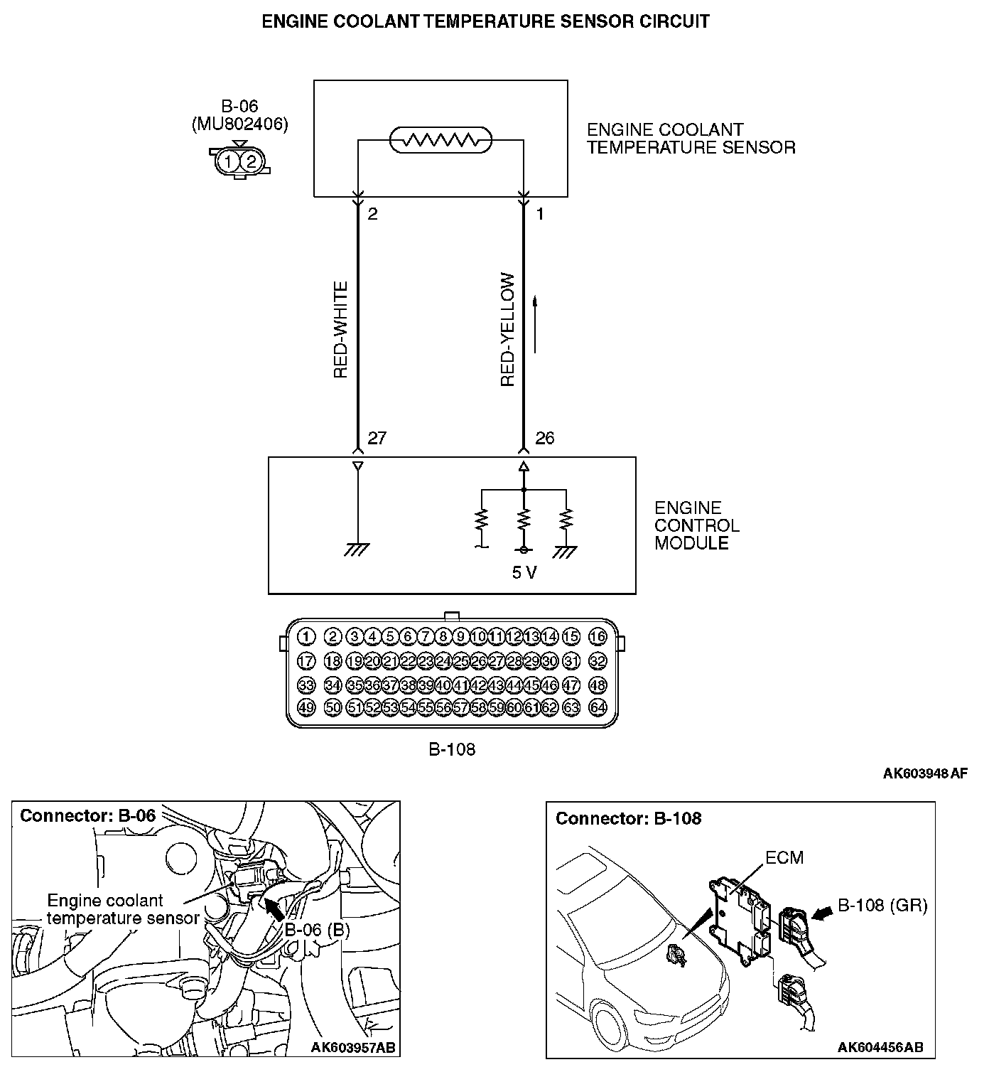 - 5-volt voltage is applied to the engine coolant temperature sensor output terminal (terminal No. 1) from the ECM (terminal No. 26) via the resistor in the ECM. The ground terminal (terminal No. 2) is grounded with ECM (terminal No. 27).