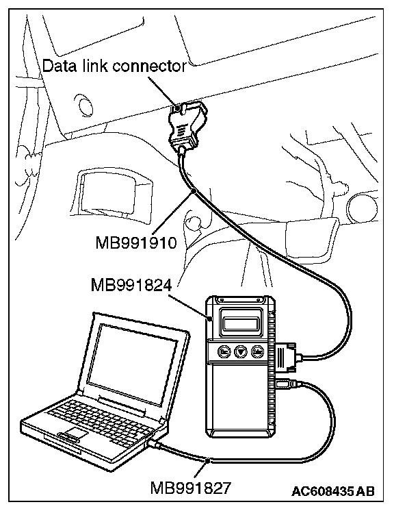 CAUTION: To prevent damage to scan tool MB991958, always turn the ignition switch to the "LOCK" (OFF) position before connecting or disconnecting scan tool MB991958.
