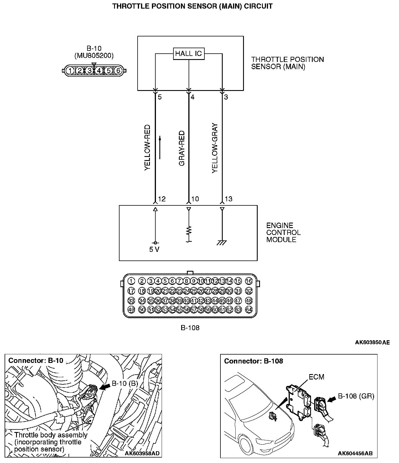 - A voltage that is according to the throttle opening angle is sent to the ECM (terminal No. 10) from the throttle position sensor (main) output terminal (terminal No. 4).