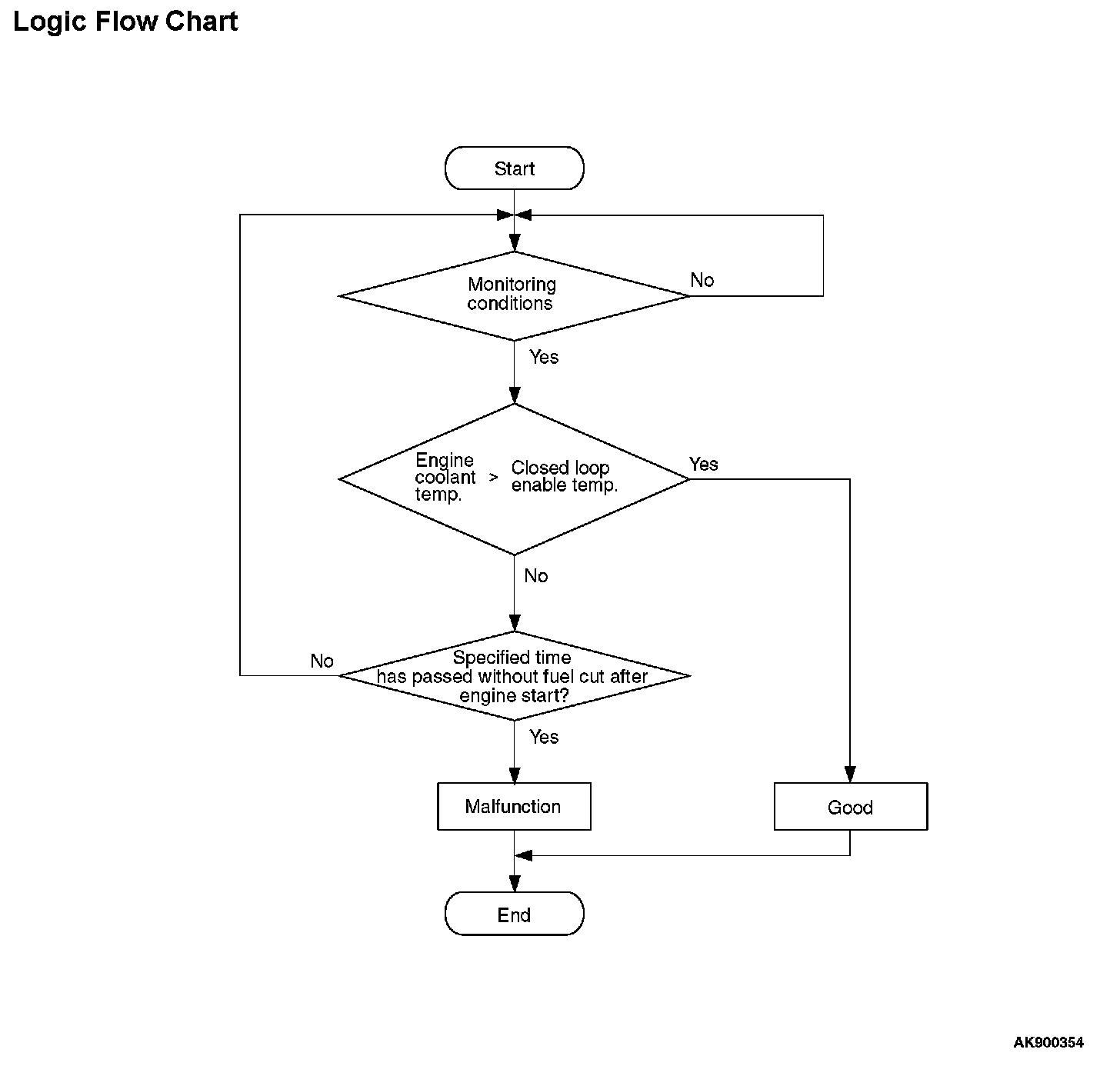 - Engine coolant temperature sensor output voltage does not reach closed loop enable temperature within specified period when engine coolant temperature sensor output voltage at engine start is under 7° C (45° F).