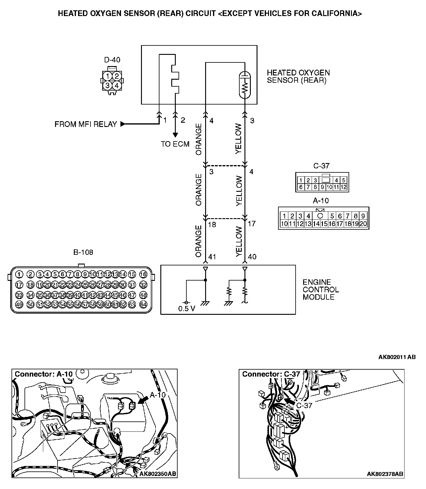 - A voltage corresponding to the oxygen concentration in the exhaust gas is sent to the ECM (terminal No. 40) from the output terminal (terminal No. 3) of the heated oxygen sensor (rear).