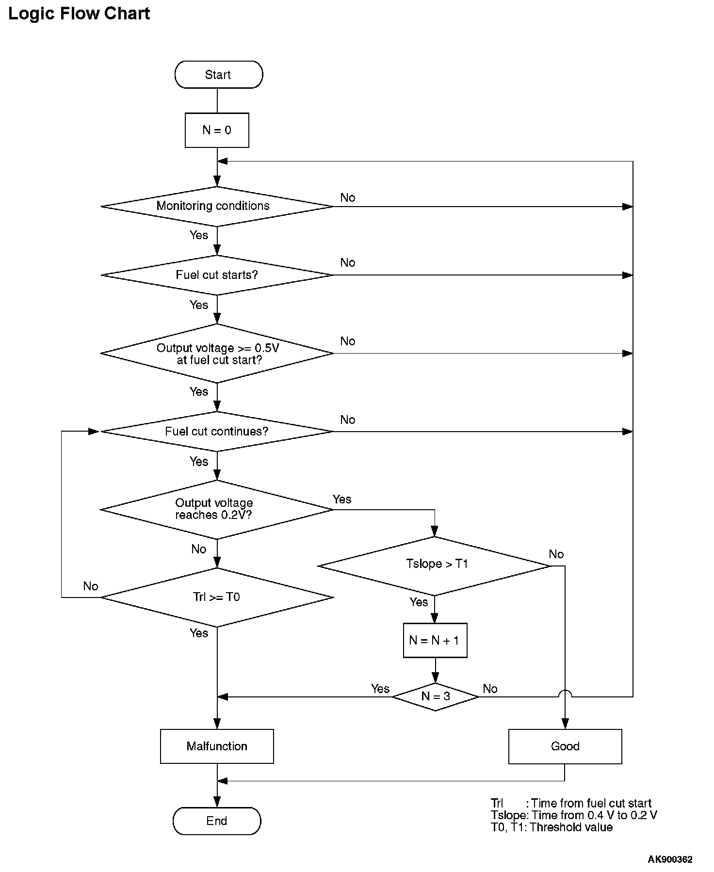 - Heated oxygen sensor (rear) output voltage does not reach 0.2 volt for 6 seconds from fuel cut start.