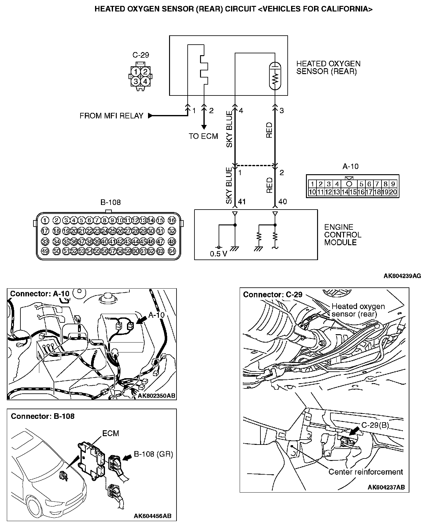 - A voltage corresponding to the oxygen concentration in the exhaust gas is sent to the ECM (terminal No. 40) from the output terminal (terminal No. 3) of the heated oxygen sensor (rear).