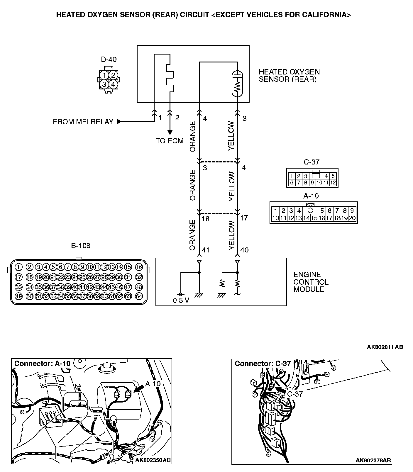 - A voltage corresponding to the oxygen concentration in the exhaust gas is sent to the ECM (terminal No. 40) from the output terminal (terminal No. 3) of the heated oxygen sensor (rear).