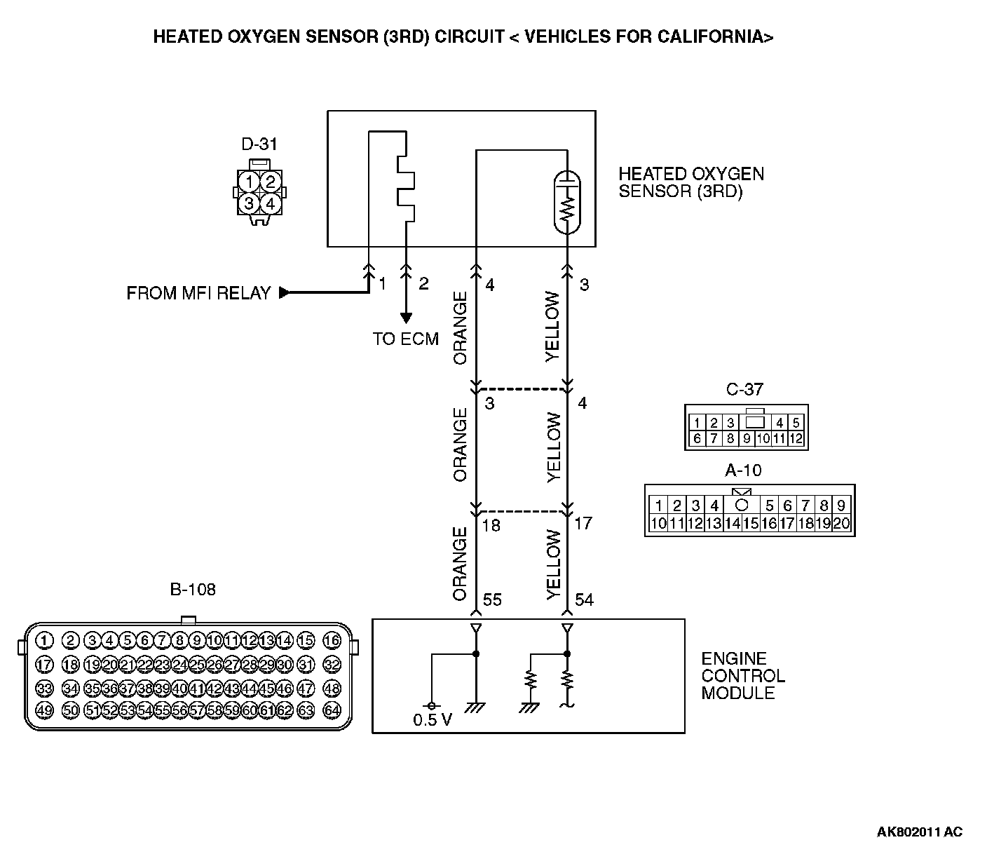 - A voltage corresponding to the oxygen concentration in the exhaust gas is sent to the ECM (terminal No. 54) from the output terminal (terminal No. 3) of the heated oxygen sensor (3rd).