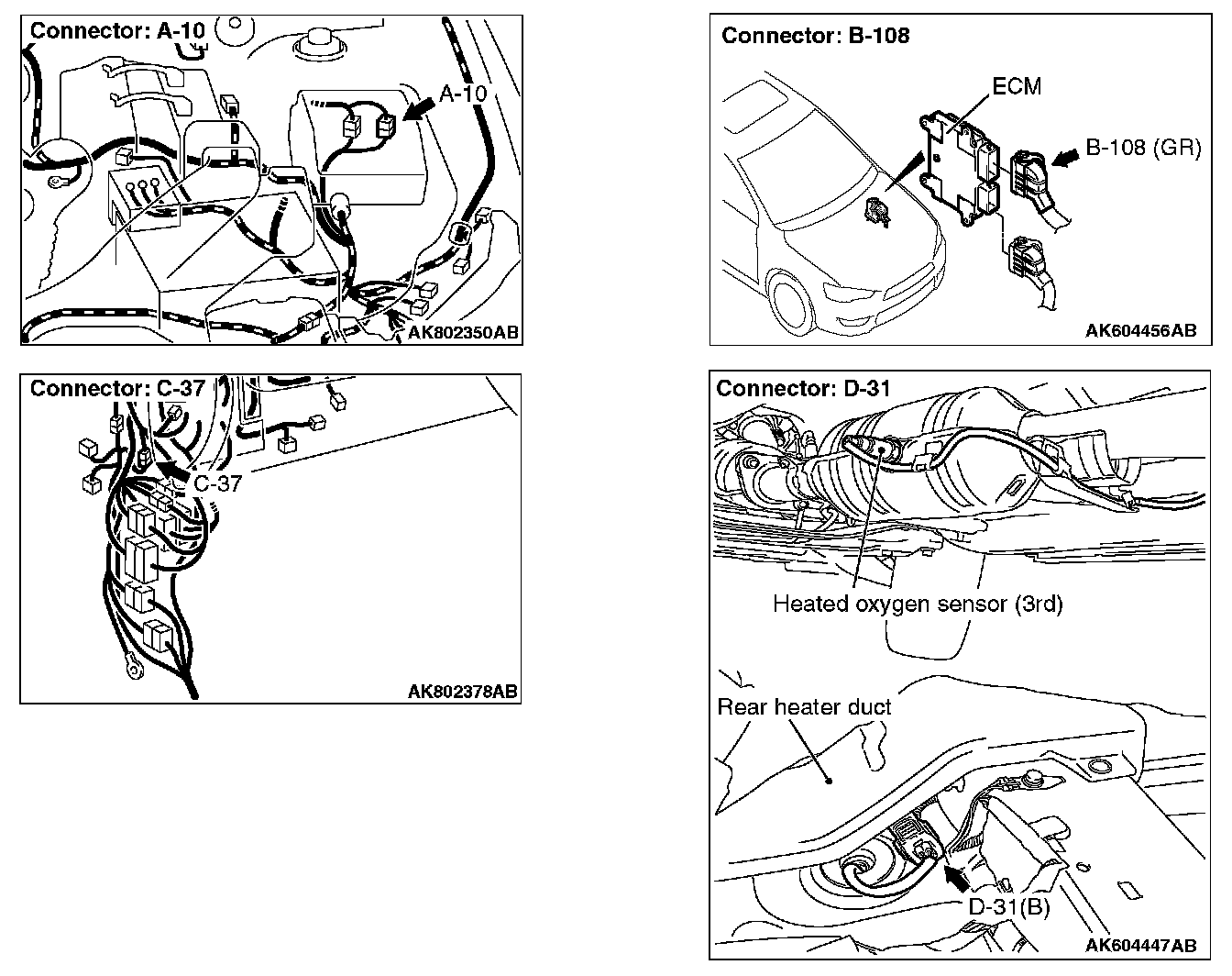 1. Disconnect the heated oxygen sensor (3rd) connector D-31 and connect test harness special tool MB991658 to the connector on the heated oxygen sensor (3rd) side.