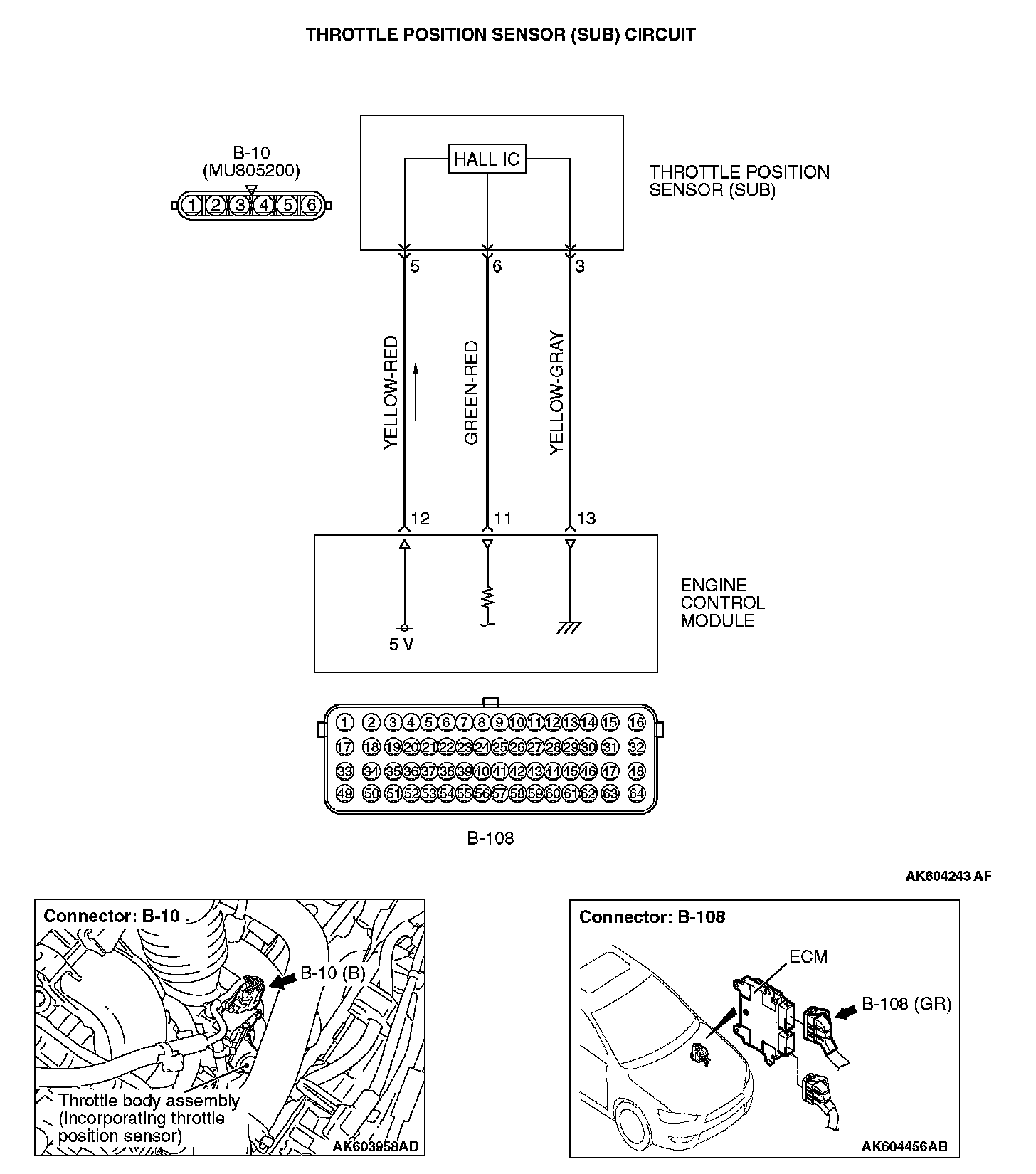 - A voltage that is according to the throttle opening angle is sent to the ECM (terminal No. 11) from the throttle position sensor (sub) output terminal (terminal No. 6).