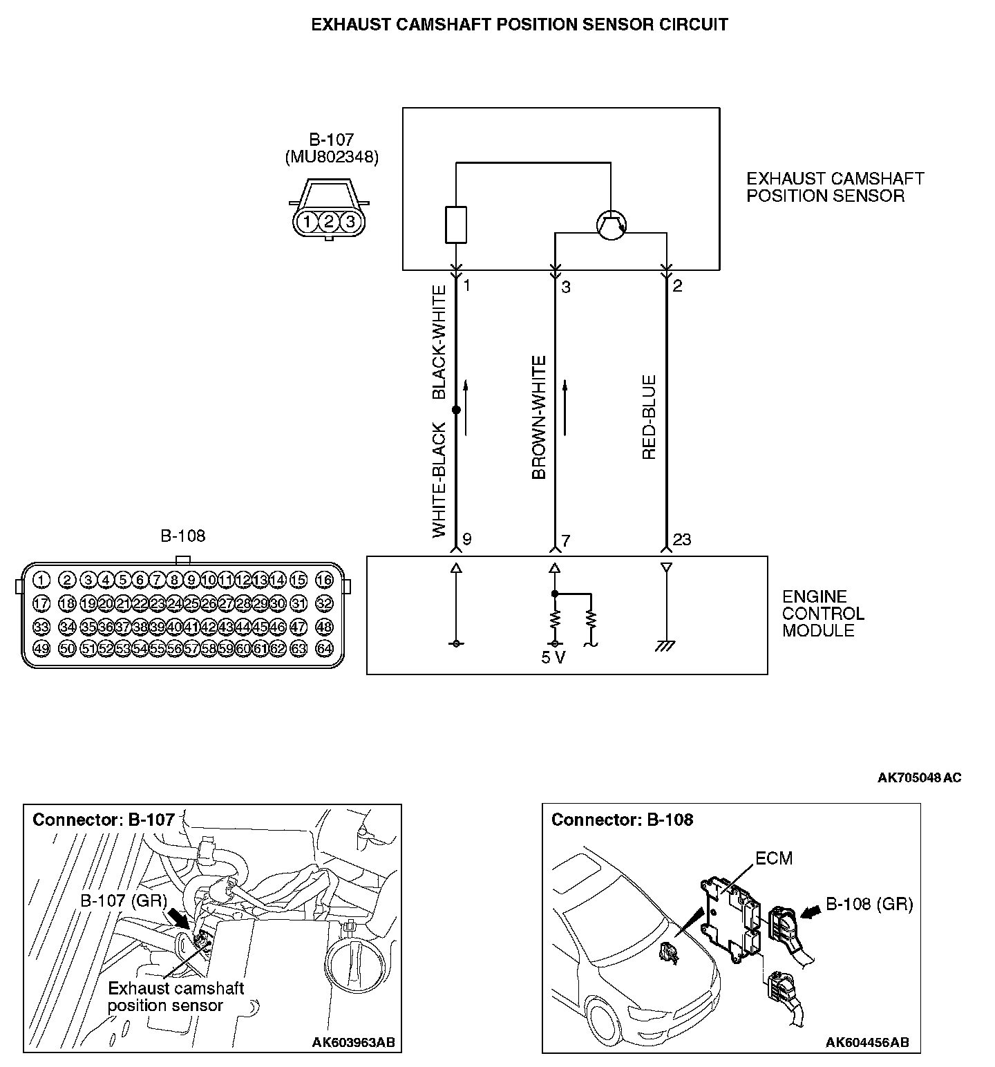 STEP 13. Check for open circuit and harness damage between exhaust camshaft position sensor connector B-107 (terminal No. 2) and ECM connector B-108 (terminal No. 23).