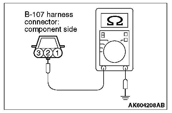 1. Disconnect the exhaust camshaft position sensor connector B-107, and connect test harness special tool MB991709 between the separated connectors. (All terminals should be connected.)