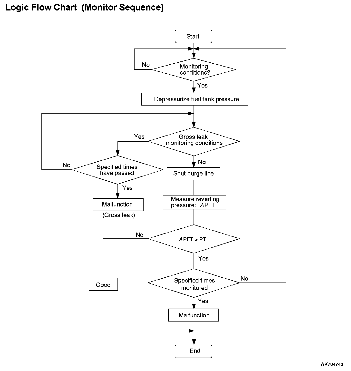 NO ["Evap Leak Mon. Discontinued. Retest again from the first" is displayed on scan tool MB991958.] : The EVAP monitor has been interrupted during the test. Turn the ignition switch to the "LOCK" (OFF) position once, and repeat the monitoring from Step 1.