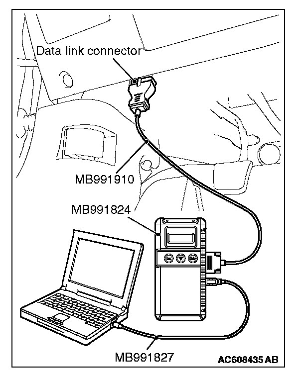 CAUTION: To prevent damage to scan tool MB991958, always turn the ignition switch to the "LOCK" (OFF) position before connecting or disconnecting scan tool MB991958.