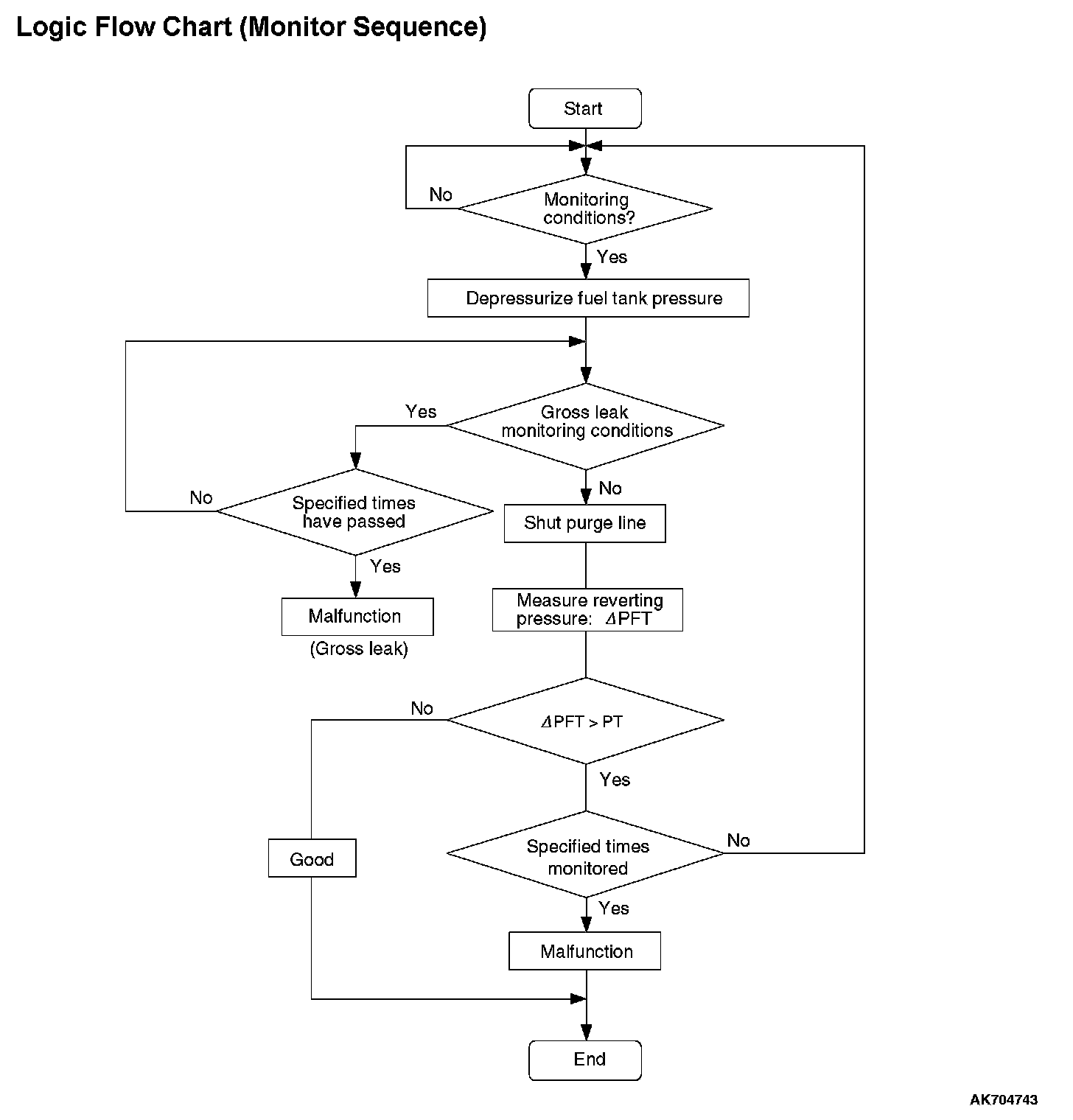 NO ["Evap Leak Mon. Discontinued. Retest again from the first" is displayed on scan tool MB991958.] : The EVAP monitor has been interrupted during the test. Turn the ignition switch to the "LOCK" (OFF) position once, and repeat the monitoring from Step 1.