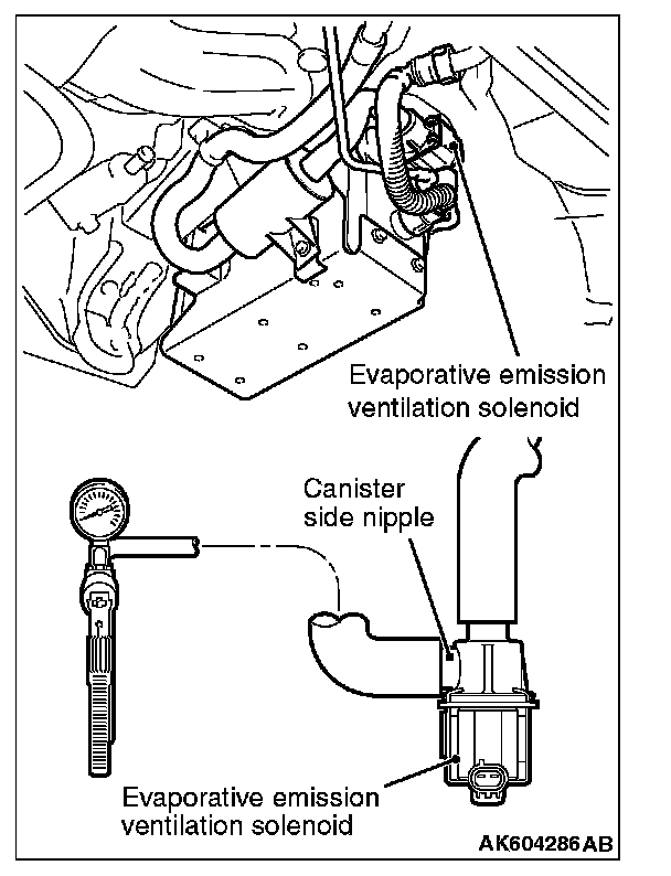 1. Connect a hand vacuum pump to the evaporative emission canister and plug the other nipples.