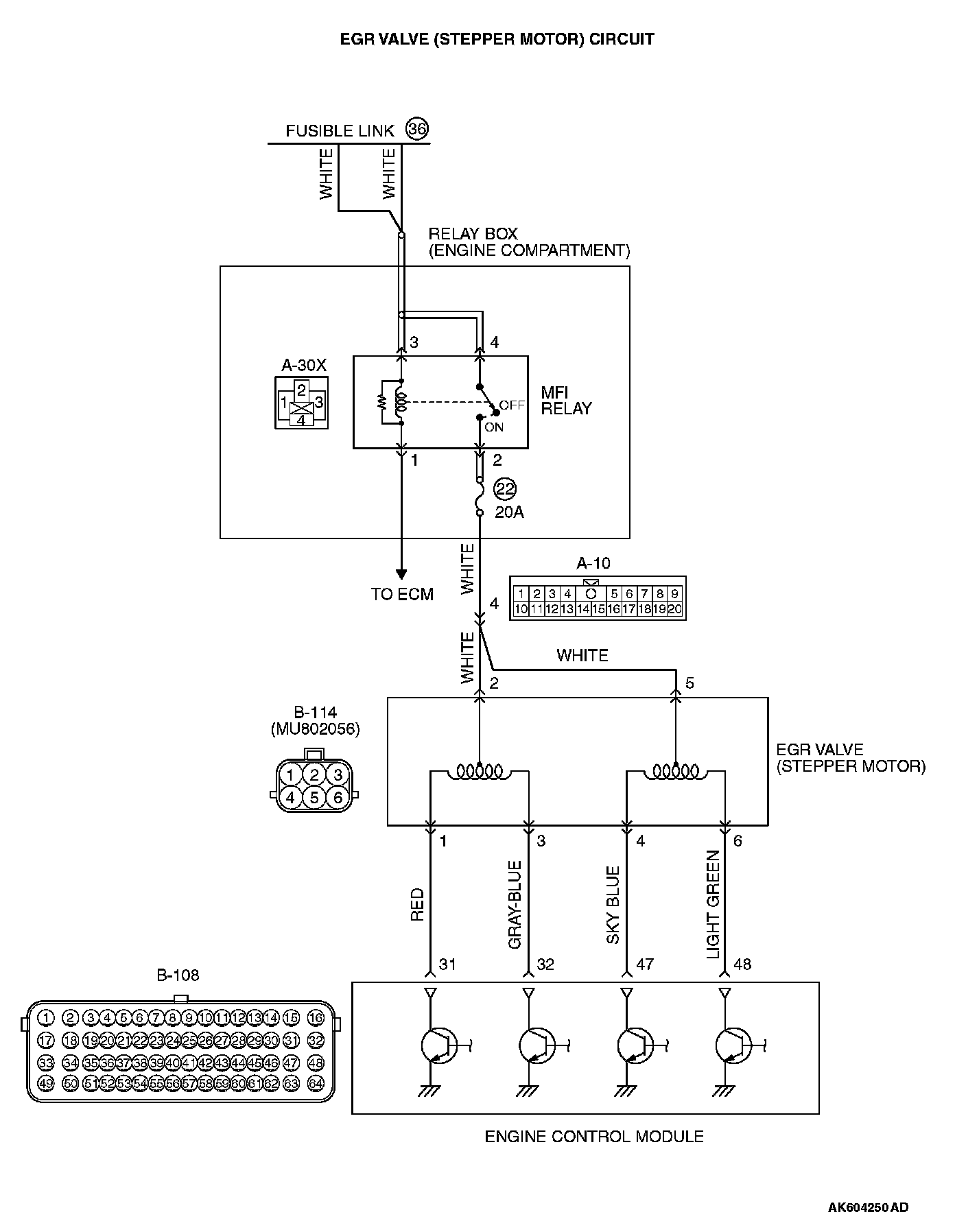 - The ECM (terminals No. 31, No. 32, No. 47, No. 48) drives the stepper motor by sequentially turning "ON" the power transistors in the ECM and providing ground to the EGR valve (terminal No. 1, No. 3, No. 4, No. 6).