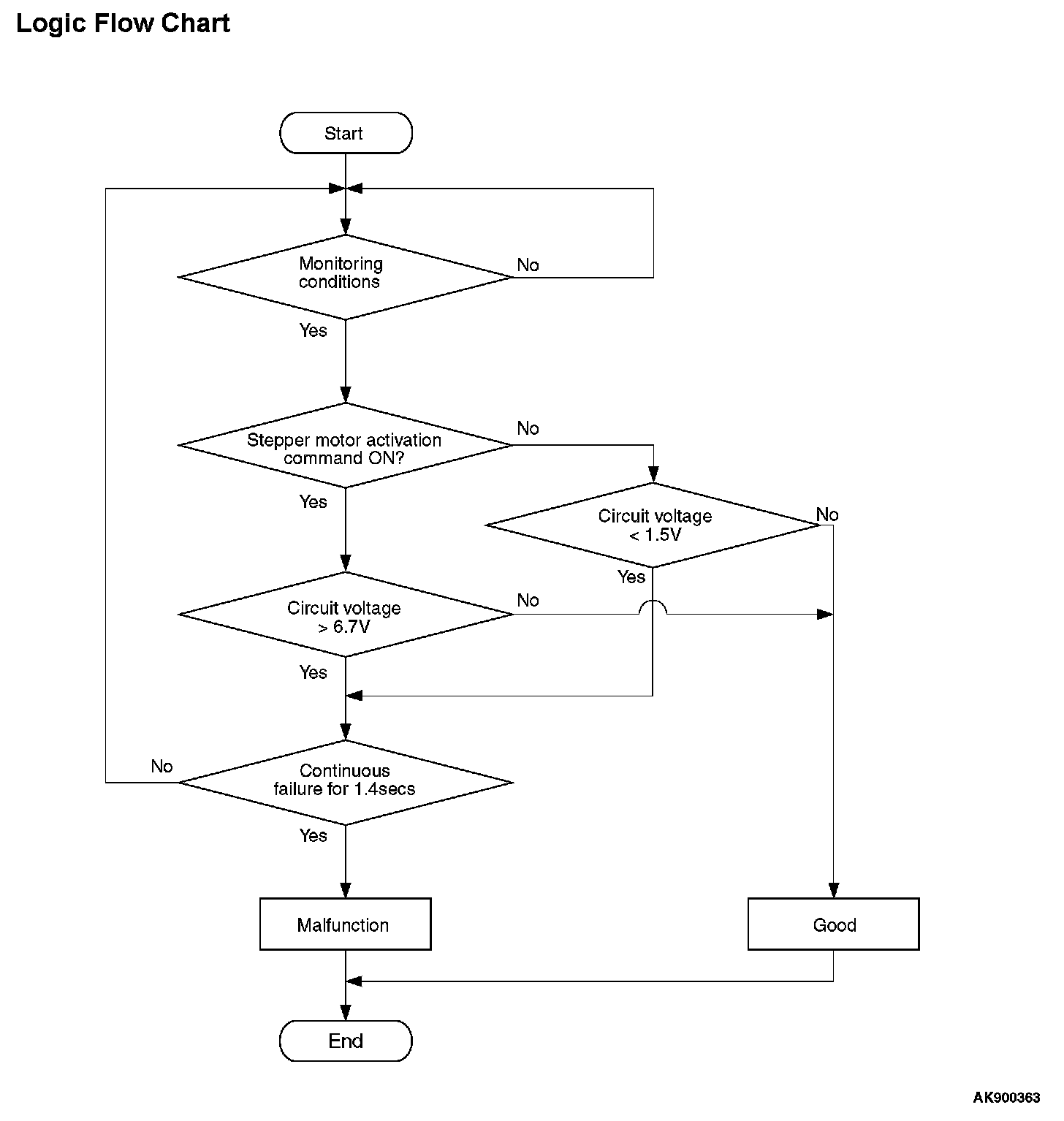 The ECM checks whether a short circuit to the ground or an open circuit exists or not by measuring the EGR valve (stepper motor) drive circuit voltage when the current is not flowing through the coil of the EGR valve (stepper motor).