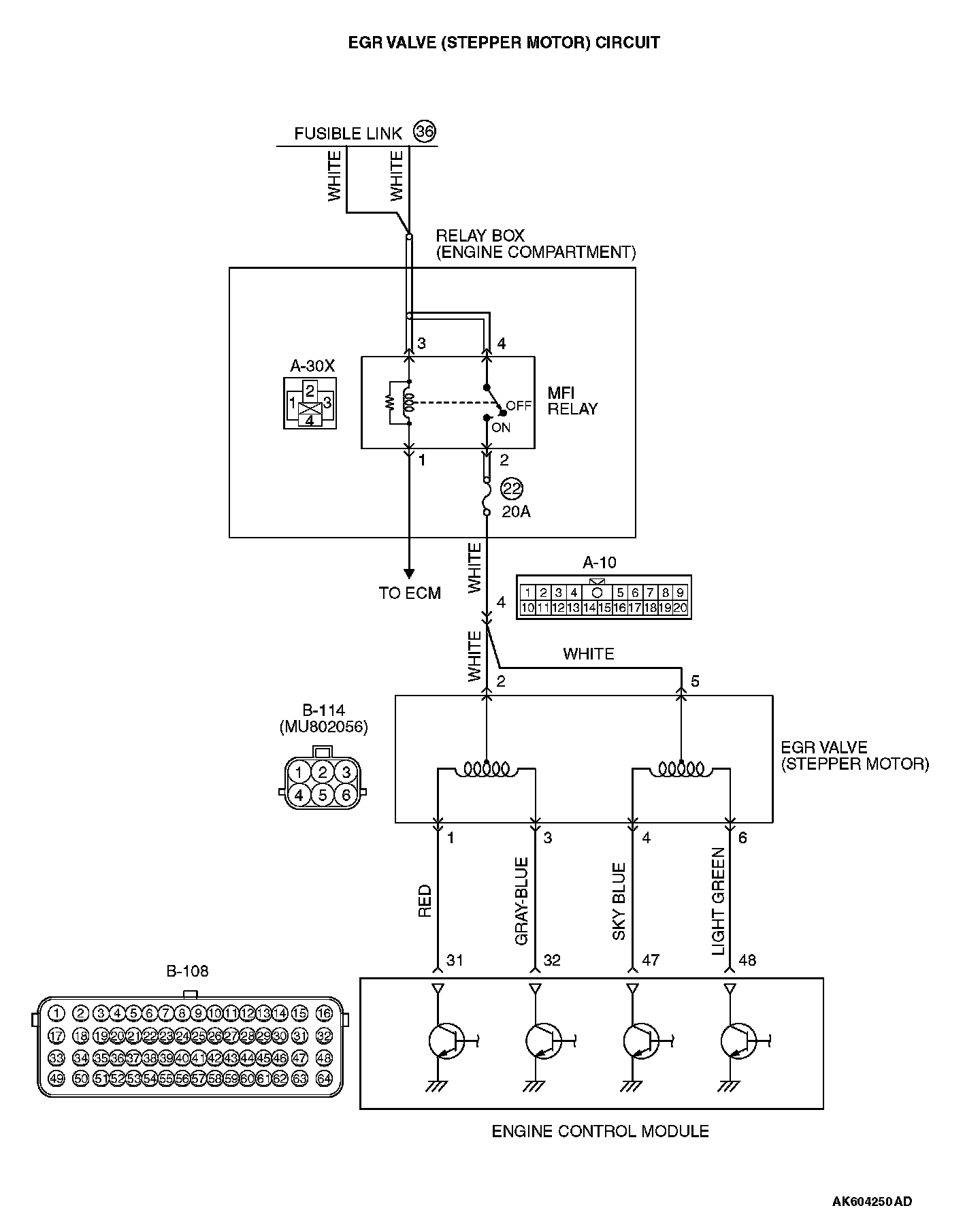 - The ECM (terminals No. 31, No. 32, No. 47, No. 48) drives the stepper motor by sequentially turning "ON" the power transistors in the ECM and providing ground to the EGR valve (terminal No. 1, No. 3, No. 4, No. 6).